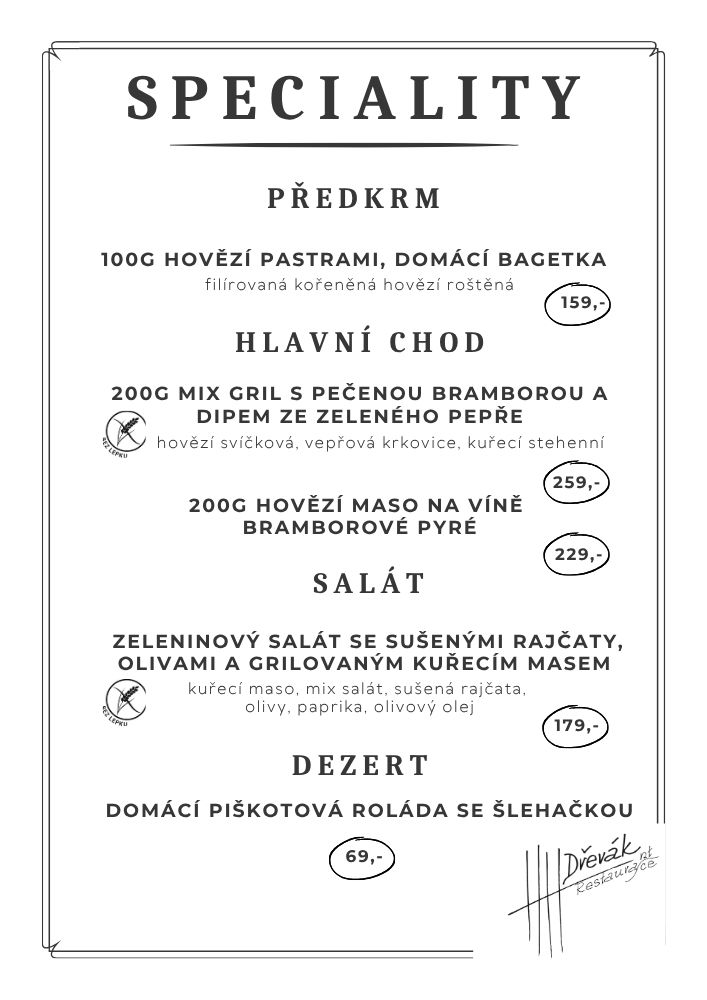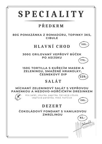 Klasická česká kuchyně: Naši kuchaři vaří z kvalitních surovin za využití moderních technologií. Zakládáme si na tradičních recepturách, které doplňujeme o sezónní speciality.